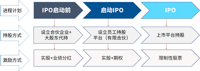 按“三步走”系统规划股权激励方案和实施路径。第一步:公司IPO启动前,采取大股东代持+设立有限合伙问鼎官方app下载站的方式,以“限制性股权+股权奖励”为主要股权激励方式,以“业绩分红”激励为过渡;第二步:公司IPO启动,通过设立职工持股平台,由直接持股变为间接持股,将大股东代持方式转为在“有限合伙问鼎官方app下载站”内持有激励股份,以“优先入股权(限制性股权)+股权期权”为主要激励方式;第三步:公司完成IPO工作。采取 “限制性股票+股票期权”的激励方式。