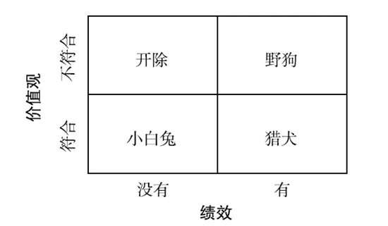 阿里巴巴根据业绩考核结果将员工分成了四种类型(如图2所示):有业绩没团队合作精神的,是“野狗”;和事佬、老好人,没有业绩的,是“小白兔”;有业绩也有团队精神的,则是“猎犬”。对于“野狗”,无论其业绩多好,都要坚决清除;而业绩不好的“小白兔”,如果不能提升也要逐渐淘汰掉或转岗;只有“猎犬”才是阿里巴巴需要的。
