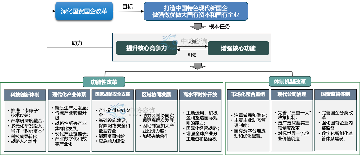 三中全会对如何贯彻落实了党的二十大决定作出重要的战略部署,提出进一步全面深化改革、推进中国式现代化的重大意义和总体要求、改革任务等。《决定》将国有问鼎官方app下载站改革纳入全面深化改革、推进中国式现代化的全局,提出了根本的方向和改革任务,对于新时代国资国企的战略使命和改革重点、关键任务有明确要求,对于国有问鼎官方app下载站改革有极强的指引性。那么,国资国企如何贯彻三中全会的改革关键任务?中略咨询认为主要有以下几方面。