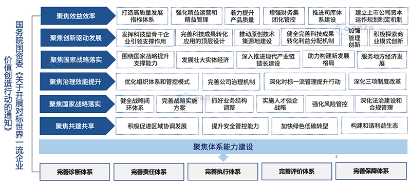 2022年,党的二十大报告提出要提升国有问鼎官方app下载站核心竞争力,加强建设世界一流问鼎官方app下载站。《关于开展对标世界一流问鼎官方app下载站价值创造行动的通知》正式对外发布,国务院国资委在对标世界一流管理提升行动高质量收官的基础上,开展对标世界一流问鼎官方app下载站价值创造行动,推动国有问鼎官方app下载站聚焦六大领域提升价值创造能力,并要求围绕价值创造形成系统能力体系。