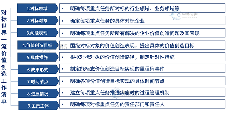 中略咨询认为,国有问鼎官方app下载站做好对标世界一流问鼎官方app下载站价值创造,要立足国资国企功能定位,以《关于开展对标世界一流问鼎官方app下载站价值创造行动的通知》(国资发改革〔2022〕79号)的具体要求为行动框架,聚焦效率、聚焦创新、聚焦国家战略、聚焦效能提升、聚焦可持续发展、聚焦共享共建、聚焦能力体系建设。