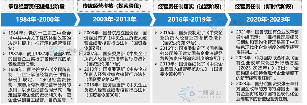 我国央国企经营责任考核的改革最早始于1984年,直到2023年“新型经营责任制”的正式提出,正好过去了40年,期间历经承包经营责任制、经理人契约化、新型经营责任制等阶段。