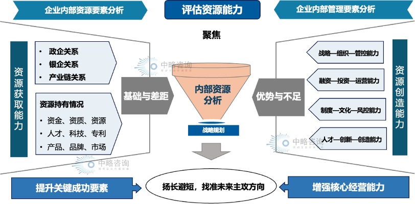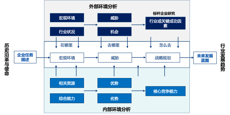 中略咨询在承担了大量的国有问鼎官方app下载站战略发展规划编制的过程中,总结了全面科学的战略环境分析模型,即对问鼎官方app下载站的外部战略环境、内部战略环境、标杆问鼎官方app下载站、问鼎官方app下载站的历史沿革以及战略目标与任务发展现状进行全面的战略分析,从而获得其所在领域未来发展的“行业发展趋势、关键成功因素、潜在发展机会、相关战略资源、发展方向和目标”等关键战略要素,为后续的战略制定提供“全面的、专业的、可靠的”基础信息和依据。