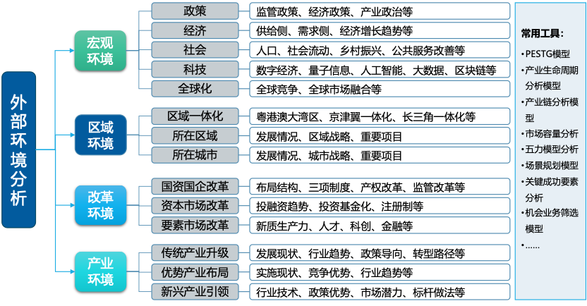 宏观环境方面:比较常用的就是借助包括政策、经济、社会、科技、全球化要素的PESTG模型,系统研究 “十五五”期间整个中国的经济走向政策,经济发展趋势,包括整个社会的一系列重点领域变革,以及科技对于整个产业驱动的赋能,要把这些宏观层面的要素影响,跟我们国有问鼎官方app下载站发展战略规划做一个有效的融合。