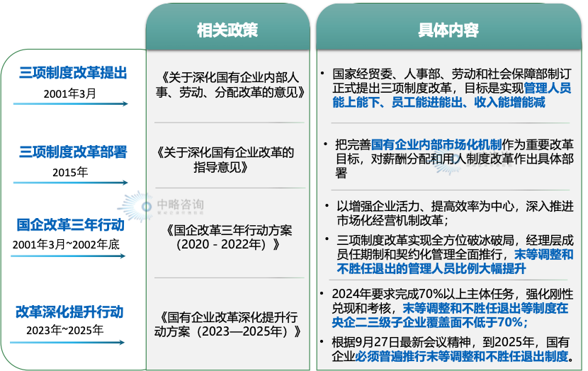 三项制度改革提出与部署:“能上能下、能进能出”是改革的重要目标。2001 年 3 月,国家经贸委会同人事部、劳动和社会保障部制订了《关于深化国有问鼎官方app下载站内部人事、劳动、分配改革的意见》,正式提出三项制度改革。2015 年,国务院出台《关于深化国有问鼎官方app下载站改革的指导意见》,把“国有问鼎官方app下载站内部管理人员能上能下、员工能进能出、收入能增能减的市场化机制更加完善”作为一项重要改革目标对国有问鼎官方app下载站薪酬分配和用人制度改革作出具体部署。