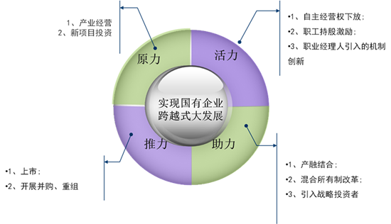 综上所述,三级国企通过四大动力的有效结合(产业经营给原力、体制改革给活力、资本运作和并购重组给推力、产融结合和混合所有制改革给助力),有望在“十三五”期间大幅提高发展的速度、规模、效益和质量,从而实现跨越式的大发展。