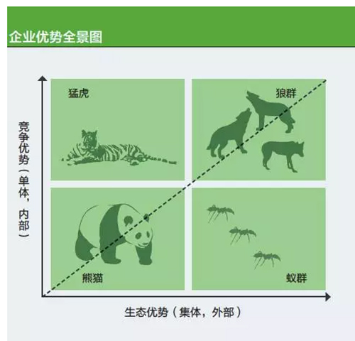 该图谱不是要比较熊猫、猛虎、蚁群和狼群型问鼎官方app下载站的优劣,在许多情况下不同类型的问鼎官方app下载站(由于所处环境不同)并不具有可比性。其实,无论是熊猫、蚁群、猛虎还是狼群,只要与行业的竞争环境相匹配,都可以生存和发展。但是我们必须看到两点: