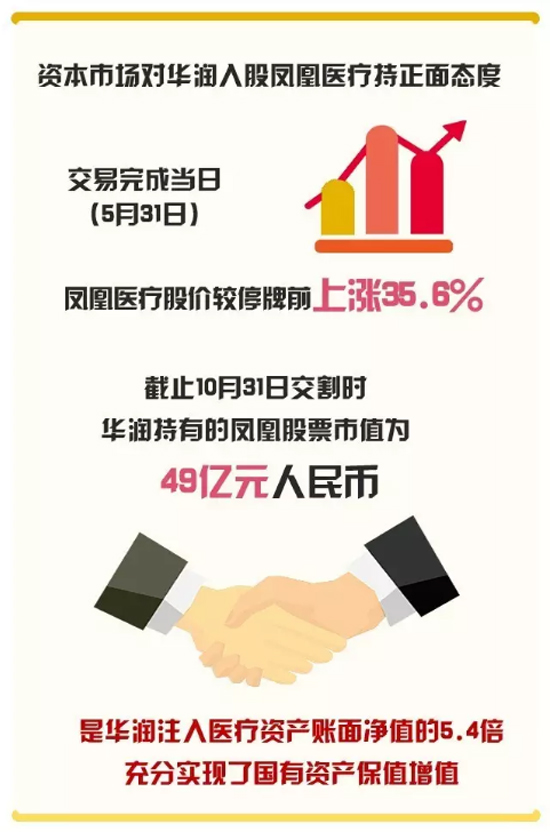 华润和中信对“华润凤凰”的持股比例分别为32.43%和9.15%。华润入股凤凰医疗参与混合制改造,产生了多赢局面: