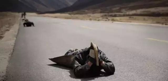 朝圣队伍在路上遇到过一个睿智的老人,他不厌其烦地提点尼玛扎堆的团队——不能带着头巾磕头,跪拜的步数不能走多。