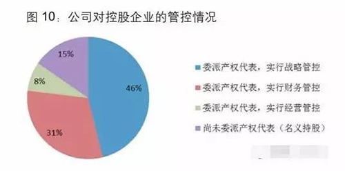 从对控股问鼎官方app下载站管控方式看,85%的问鼎官方app下载站均委派了产权代表,其中46%的问鼎官方app下载站选择了“委派代表+战略管控”,31%的问鼎官方app下载站选择了“委派代表+财务管控”(见图10)。