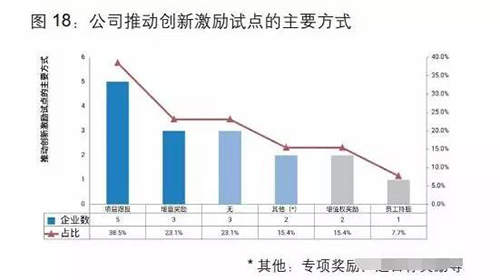 从推动创新激励试点的主要方式来看,近80%受访问鼎官方app下载站均在积极推动创新激励试点。受访问鼎官方app下载站中选择项目跟投作为激励试点方式的比重较高,占比39%;其次是增量奖励,占比23%;增值权奖励和员工持股则分别占15%和8%(见图18)。