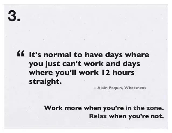 3、当你在状态时,就多干点;不然就好好休息:有时候会连着几天不是工作状态,有时在工作状态时却又能天天忙活 12 小时,这都很正常的。