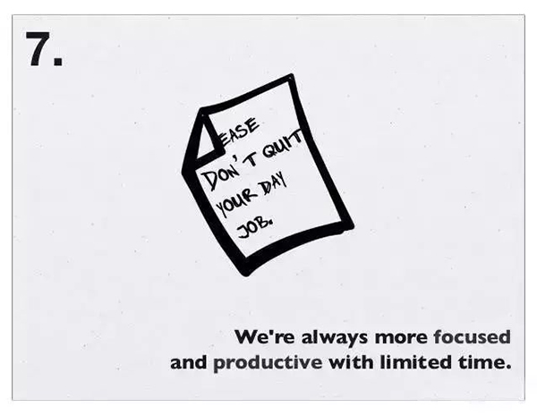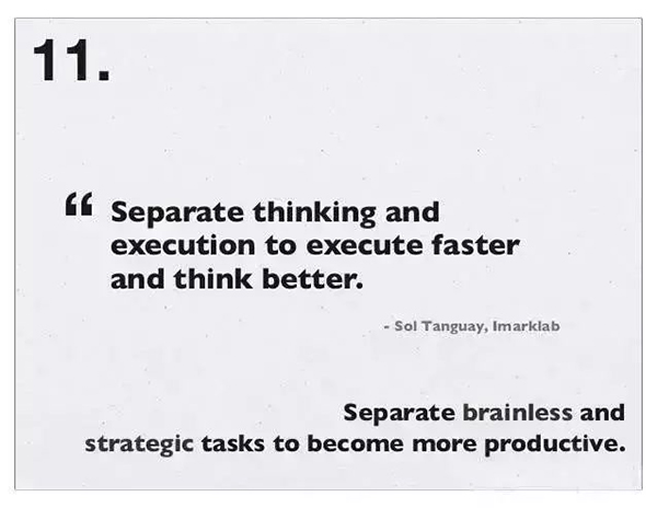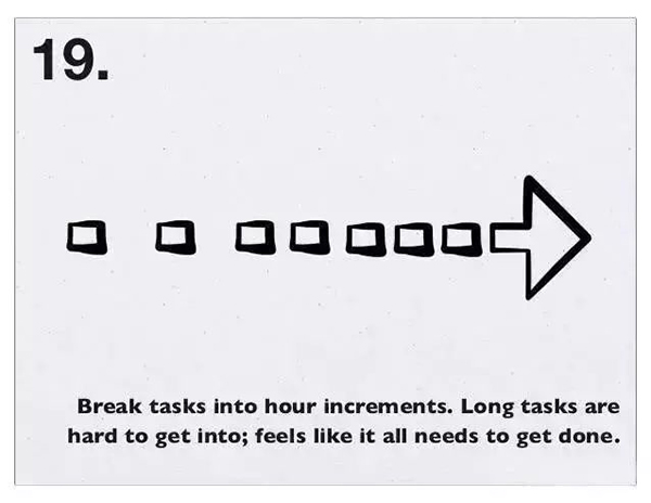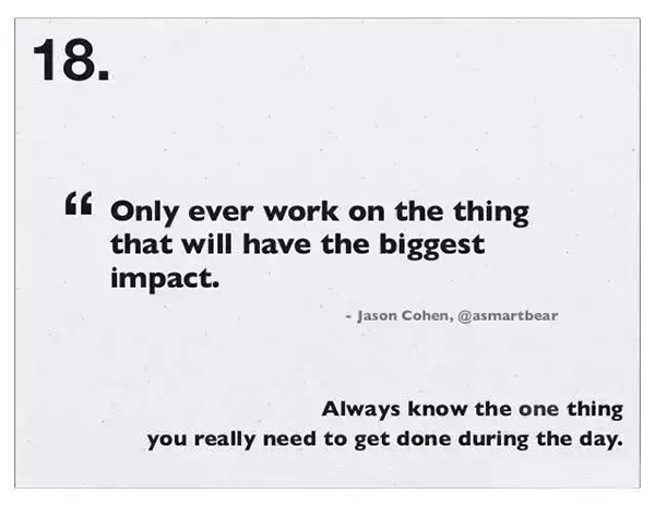 18、必须清楚白天必须完成的那件事是什么。“Only ever work on the thing that will have the biggest impact.” 只去做那件有着最大影响的事情。——Jason Cohen