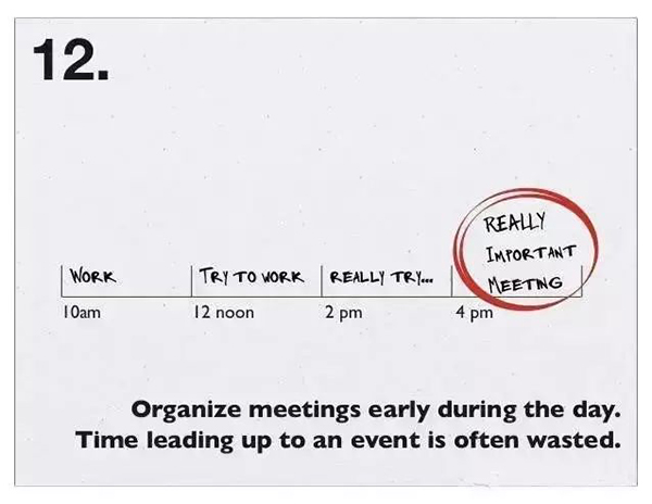 12、有会议就尽早安排,用于准备会议的时间往往都浪费掉了。