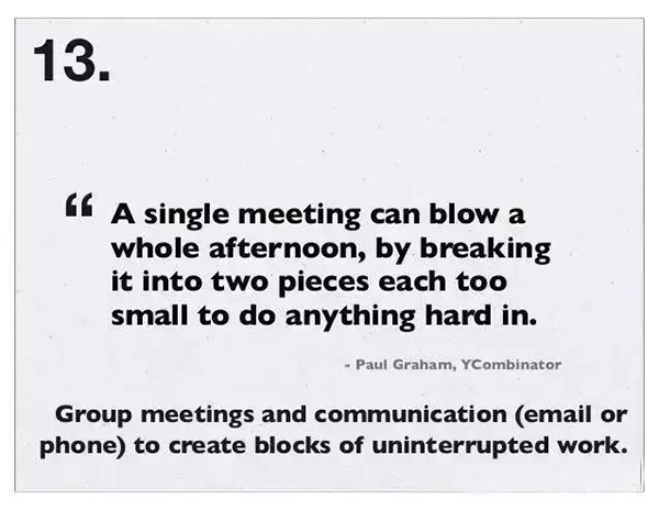 13、把会议和沟通 (邮件或电话) 结合,创造不间断工作时间:一个小会,也会毁了一个下午,因为它会把下午撕成两个较小的时间段,以至于啥也干不成。