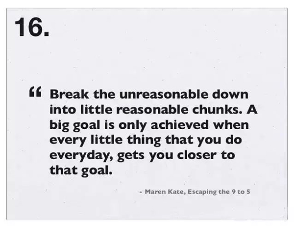16、把不切实际的任务分割成合理的小任务,只要每天都完成小任务,你就会越来越接近那个大目标了。
