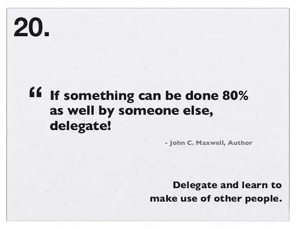 20、授权并擅用他人的力量。——君子善假于物(人)也,如果某件事其他人也可以 做到八成,那就给他做!