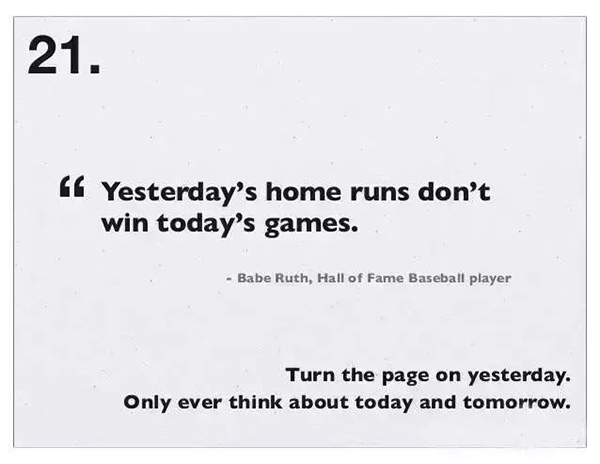21、把昨天翻过去,只考虑今天和明天。昨天的全垒打赢不了今天的比赛。——好汉不提当年勇。