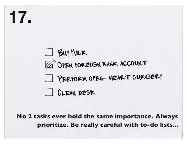 17、从来没有两个任务会有相同的优先级,总会有个更重要,仔细考虑待办事情列 表。