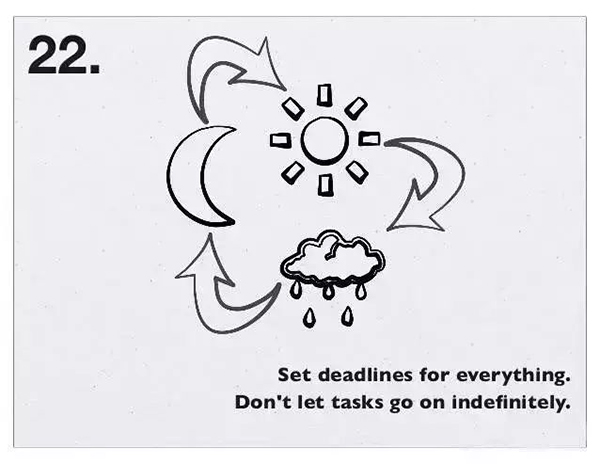 22、给所有事情都设定一个期限。不要让工作无期限地进行下去。