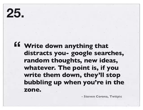 25、进入高效状态后,记下任何分散你注意力的东西比如Google搜索词、灵光乍 现的想法、新点子等等。如果你把它们记下来,它就不会再蹦来蹦去了。