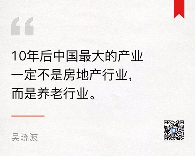 中国经济总量逼近美国,中国的城市化人口达到9.4亿,70%的人变成城市人,中国的老龄化人口超过30%,所以10年后中国最大的产业一定不是房地产行业,而是养老行业,养老行业会成为中国第一大行业。