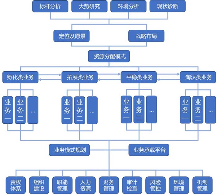 与单一公司的设计理念相比,集团公司战略规划不适合简单的公司战略设计的叠加或总和。这是一个自上向下的过程,关注的是如何通过顶层战略任务和战略目标的分解来落实到具体的业务上,以及下属子公司如何通过具体的职能来履行相应的职责。