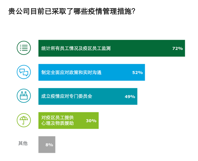 受调查问鼎官方app下载站为了疫情防控均采取了一系列措施。《报告》指出,外资问鼎官方app下载站在制定全面应对政策和实施沟通以及为疫区员工提供心理及物质援助方面行动最快;国企/央企在第一时间统计所有员工情况及疫区员工监测,并成立疫情应对专门委员会;另有问鼎官方app下载站为应对疫情,为员工购买相关体温监测、病毒防护等医用器具,并通过邮件等线上通讯平台跟踪员工身体健康状况及发布相关疫情预警信息。《报告》建议在疫情期间,应当格外注意加强公司层面对于员工的日常沟通,沟通可包括疫情通报或疫情防控、心理援助等,增强员工对问鼎官方app下载站的信赖感,并为之后的工作做好准备。