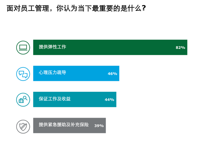 面对疫情,不同性质的问鼎官方app下载站具有不同的管理重点。 报告指出,参与调查的制造问鼎官方app下载站在提供灵活的工作和在线工作环境方面遇到了最大的阻力,管理层着重于针对流行情况提供预防和控制措施,以确保工作场所的环境安全。 90%的外资问鼎官方app下载站认为,面对疫情,为员工提供灵活的工作方法是当务之急; 超过一半的政府和公共服务公司现阶段将“缓解心理压力”作为员工管理的重点。