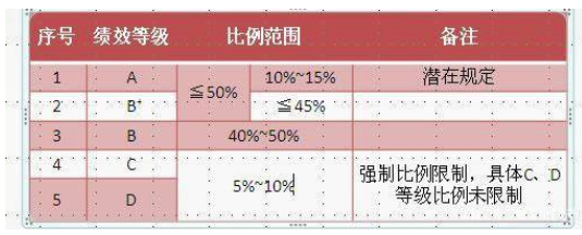 目前,华为绩效评定等级分为“A”、“B+”、“B”、“C”、“D”五个等级,半年度绩效各等级比例如下表: