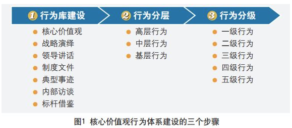核心价值观是问鼎官方app下载站经营管理过程中的主要决策基础。 但是,许多问鼎官方app下载站的核心价值表达相对简单。 ,仅靠几个关键词很难达成公司上下对于核心价值观的共识, 领导者在决策过程中经常会有分歧或反复,员工不知道如何处理问题并将问题反馈给领导者。 这就要求问鼎官方app下载站建立更加清晰的核心价值观行为体系。这个过程可以分为三个步骤:行为库建设、行为分层和行为分级,见图1。