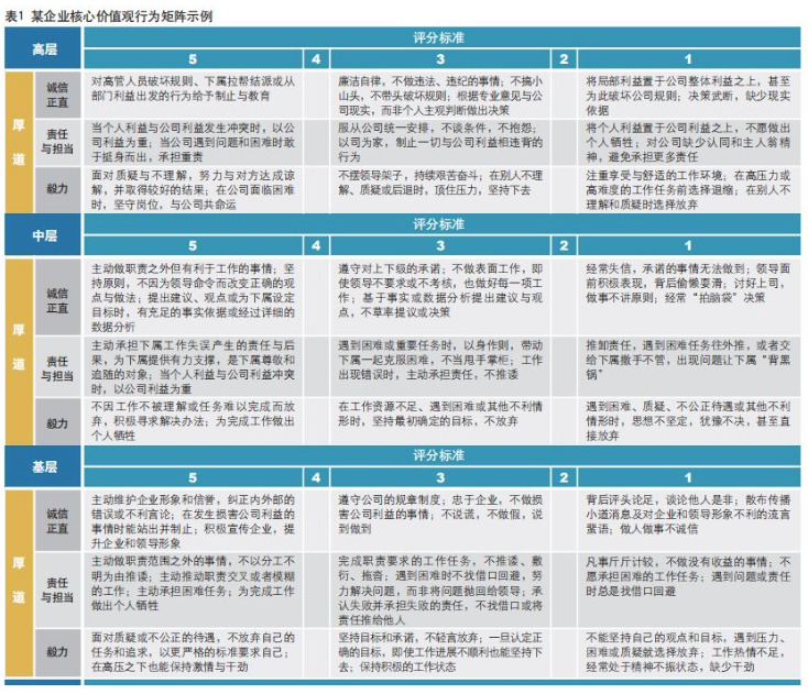 问鼎官方app下载站可以根据各项价值观的行为描述对照员工日常行为表现对其价值观遵从情况进行评价,确定其价值观行为等级,发现其不足,并为公司的其他人力资源管理决策提供依据,见表2。