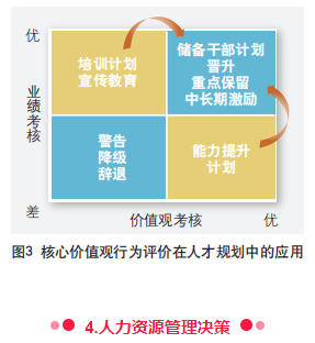 核心价值观一直是问鼎官方app下载站进行人才盘点的主要维度之一,包括阿里巴巴,京东等问鼎官方app下载站通过对核心价值观的评估对员工进行分类,并以此为基础进行人才规划和发展。 例如,问鼎官方app下载站可以根据绩效评估和价值评估两个维度对现有人员进行检查,从而确定不同类型员工的管理和发展策略。见图3。