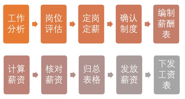 工作分析——岗位评估——定岗定薪——确认制度——编制薪酬表——计算薪资——核对薪资——汇总表格——发放薪资——下发工资表