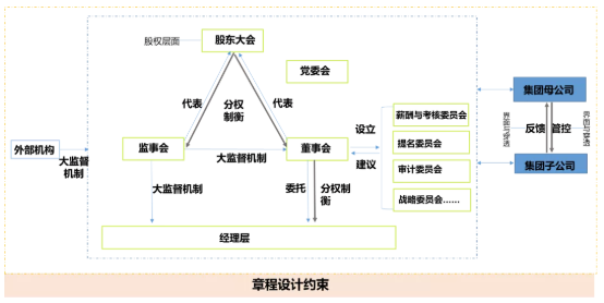 如上图,治理机制的优化首先在集团母子公司层级内进行,包括“三会一层”、党委会的单层面考量,形成对母子公司层级内的管控优化。接下来通过解决母子公司的界面与穿透问题,形成集团母公司对子公司的管控,以及子公司对母公司的反馈,体现母公司对子公司的权利渗透。在此基础上,通过集团公司章程的设计,对上述内容形成明文约束。另外,治理机制优化过程中,还应当建立由公司内部监督机制以及外部监督机制相结合而成的大监督机制。