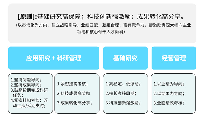 本次薪酬改革坚持以市场化为导向,坚持“战略引导、业绩匹配、差距合理、富有竞争力、符合科研管理规律的薪酬管理体系”的基本原则,使有限的激励资源大幅度向主业领域和核心骨干人才倾斜,通过创新激励模式,多措并举,打好薪酬改革组合拳。