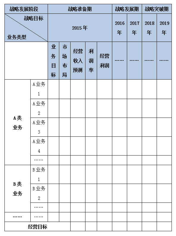 依照业务战略规划设定,在业务目标下,具体给出不同战略发展阶段内,调整业务的发展要求:深入发展、保持现状、退出等。以及为保证业务目标的达成,具体操作方法为:组织调整、人才调配、资源整合、业务模式转变、外部并购,以及在该战略阶段内的具体执行计划。