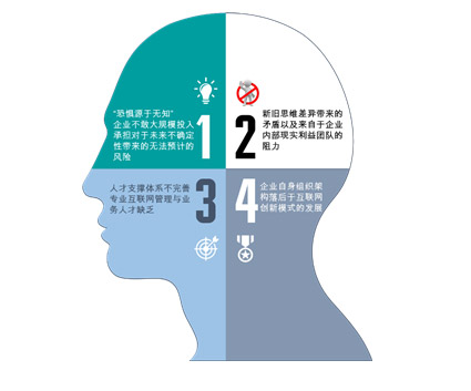 然而互联网+并非所有传统问鼎官方app下载站的灵丹妙药,传统问鼎官方app下载站拥抱互联网最大的障碍反而是你曾经成功的经验,传统经济世界的人是否能够进入新的互联网经济世界呢?可能性当然有,但过程会非常痛苦。当下,包括互联网创业者在内的许多人都要努力习得新的思维方式。而这并非易事。“看不见-看不起-看不懂-来不及”是马云对人们面对新商机时所做出反应的经典总结。尤其对于传统问鼎官方app下载站家来说,曾经的成功经验更是会成为其向互联网思维转型的最大障碍。‘互联网+’时代,传统问鼎官方app下载站面临严峻的转型问题,亟需再造新生。